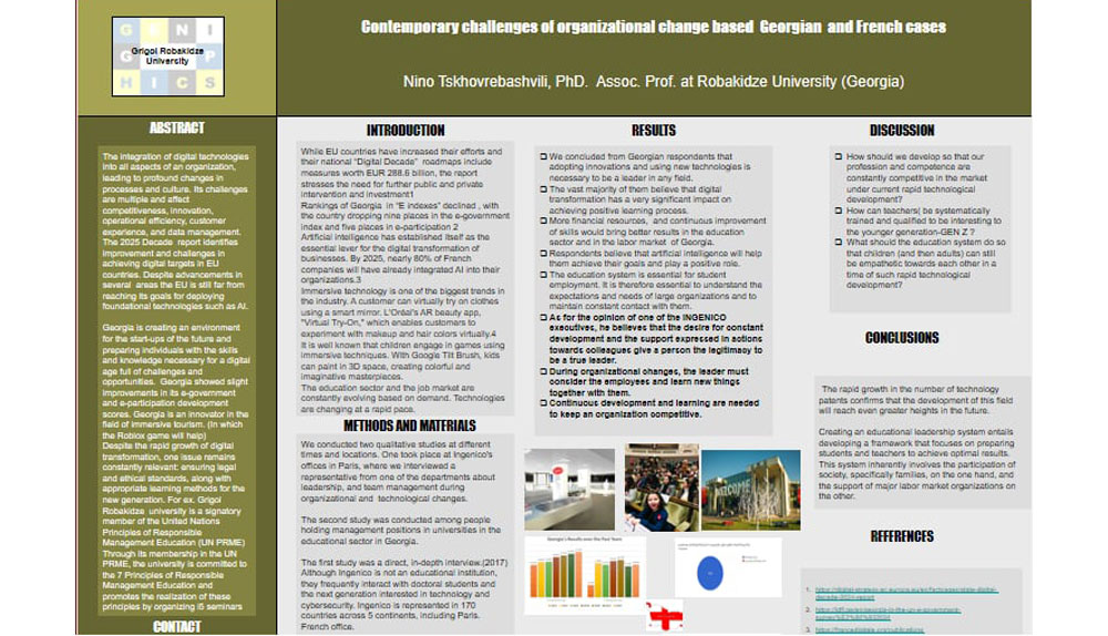 კონფერენციაზე ნინო ცხოვრებაშვილმა წარადგინა ნაშრომი: „ორგანიზაციული ცვლილებების თანამედროვე გამოწვევები ქართული და ფრანგული გამოცდილების ანალიზით“.