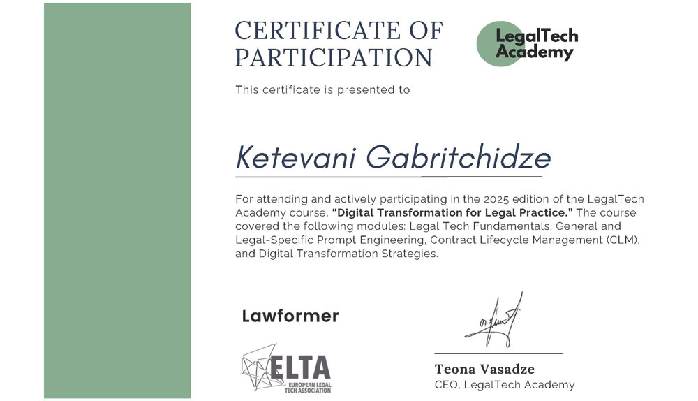 გრიგოლ რობაქიძის სახელობის უნივერსიტეტის სამართლის სკოლის დოქტორანტი და დეკანის მოადგილე, ქეთევან გაბრიჭიძე, უნივერსიტეტის დაფინანსებით, მონაწილეობდა საერთაშორისო პროგრამაში - „Digital Transformation for Legal Practice“, რომელიც გაიმართა ევროპის იურიდიული ტექნოლოგიების ასოციაციის (ELTA), კომპანიების: Lawformer-ისა და LegalTech Meetup-ის ერთობლივი ორგანიზებით.