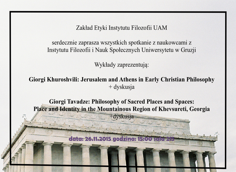 2015 წლის 26 ნოემბერს ფილოსოფიისა და სოციალურ მეცნიერებათა კვლევითი ინსტიტუტის მეცნიერ-თანამშრომლებმა, ასოც. პროფ. გიორგი ხუროშვილმა და ასოც. პროფ. გიორგი თავაძემ წაიკითხეს მოხსენებები ადამ მიცკევიჩის სახელობის უნივერსიტეტის (პოზნანი, პოლონეთი) ფილოსოფიის ინსტიტუტში. გიორგი ხუროშვილის მოხსენება ეხებოდა თემას: „იერუსალიმი და ათენი ადრეულ ქრისტიანულ ფილოსოფიაში“, ხოლო გიორგი თავაძემ წაიკითხა მოხსენება თემაზე „საკრალური ადგილებისა და სივრცეების ფილოსოფია. ადგილი და იდენტობა ხევსურეთში“.