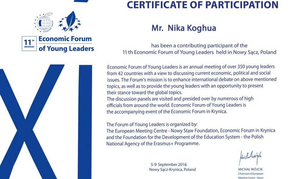 ბიზნესისა და მართვის სკოლის, ბიზნესის ადმინისტრირების საბაკალავრო პროგრამის სტუდენტმა, ნიკა კოღუამ მონაწილეობა მიიღო პოლონეთში გამართულ XI საერთაშორისო ეკონომიკური ფორუმის მუშაობაში - “11th Economic Forum of Young Leaders“, რომელიც ეხებოდა ევროპის ქვეყნებში განათლების, თავდაცვის და ეკონომიკის სფეროში არსებულ პრობლემებს და მათი გადაჭრის გზებს. ფორუმის ფარგლებში იგი შეხვდა პოლონეთის პრემიერ-მინისტრს და ევროპის სხვადასხვა ქვეყნის დელეგაციას.