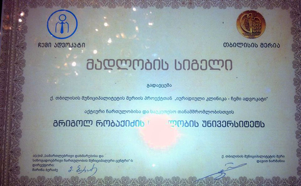საზეიმო ღონისძიებაზე, თბილისის მუნიციპალიტეტის მერიამ და იურიდიულმა კლინიკამ ჩემი ადვოკატი, გრიგოლ რობაქიძის უნივერსიტეტს, პროექტში აქტიური მონაწილეობისა და საუკეთესო თანამშრომლობისათვის, მადლობის სიგელი გადასცა.
