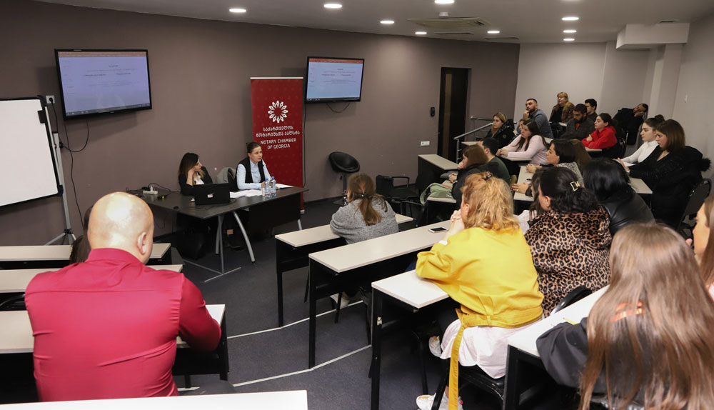 შეხვედრაზე მოწვეულმა სტუმრებმა სტუდენტებს გააცნეს ინფორმაცია ნოტარიუსთა პალატის მიერ გამოცხადებული სტაჟირებისა და საკვალიფიკაციო გამოცდის შესახებ. ისაუბრეს, აგრეთვე, შემდგომში დასაქმების მიზნით იმ აუცილებელი მოთხოვნების შესახებ, რომლებსაც მომავალი ნოტარიუსი უნდა აკმაყოფილებდეს.