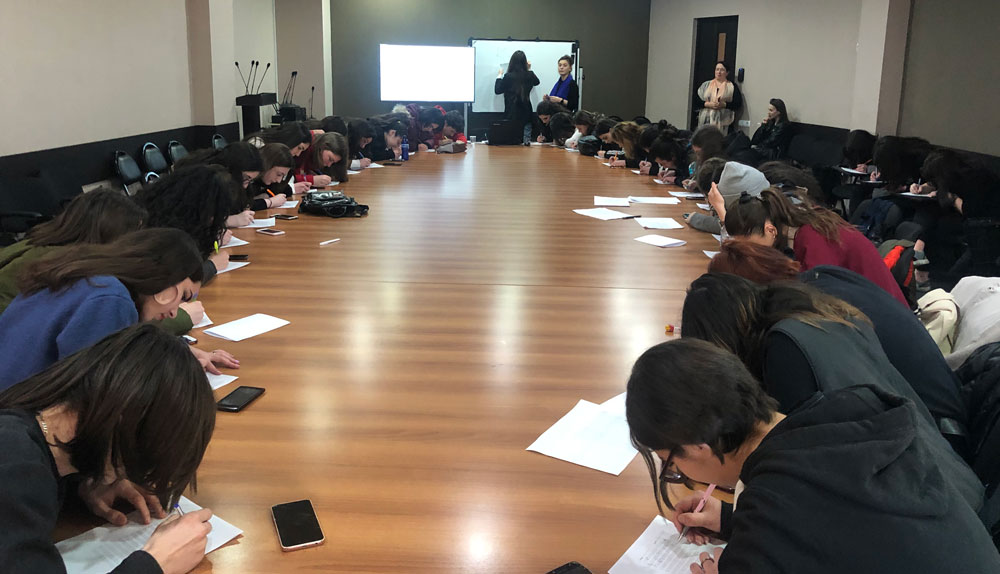 საინფორმაციო შეხვედრის შემდეგ, ფსიქოლოგიის მიმართულების დამამთავრებელი კურსის წარჩინებულმა სტუდენტებმა: როენა ბახიამ, სალომე ბერუაშვილმა და მანანა გელაშვილმა მოსწავლეებს განსახილველად შესთავაზეს თემა: “XXI საუკუნის გამოწვევები“ და მათთან ერთად ისაუბრეს ისეთი მნიშვნელოვანი საკითხების შესახებ, როგორიცაა: მავნე ჩვევები, ემოციების მართვა, ყურადღების დეფიციტი, ქცევითი დარღვევა და ჰიპერაქტიულობის სინდრომი, ბულინგი, დეპრესია, მისი გამომწვევი მიზეზები და სხვა საკითხები.