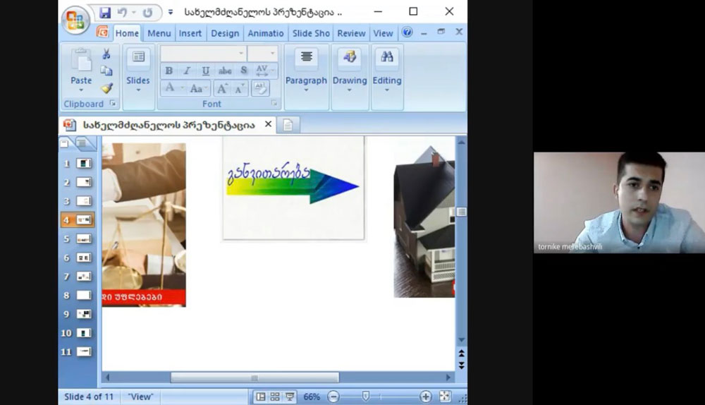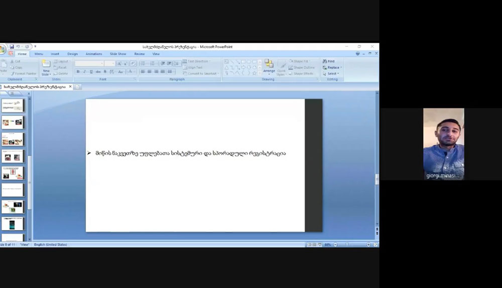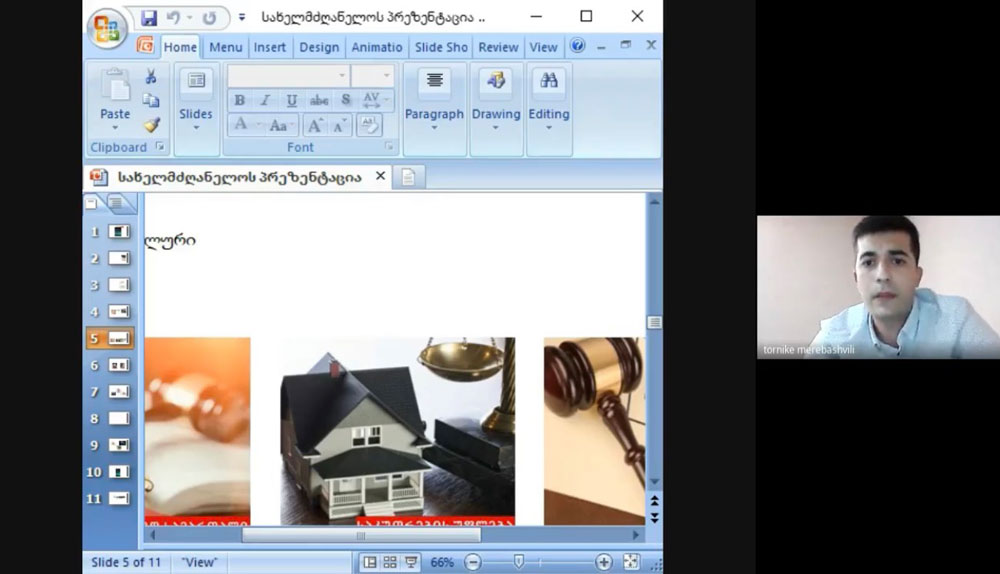 ნაშრომის პრეზენტაცია დისტანციურად გაიმართა და მას სტუდენტებთან ერთად ესწრებოდნენ: უნივერსიტეტის რექტორი, პროფესორი მამუკა თავხელიძე, რექტორის მოადგილე და სამართლის სკოლის დეკანი, პროფესორი გულიკო გალდავა, პროფესორები ნინო ჭიპაშვილი და მერი ლომია.
