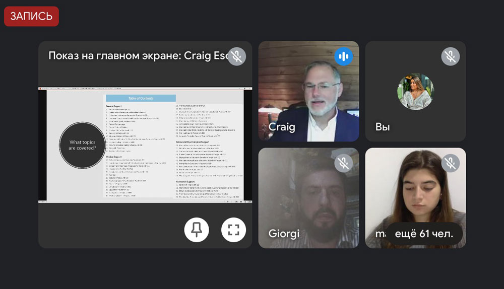 ვებინარის მთავარმა მომხსენებლებმა დოქტორმა კრეიგ ესქიუდიმ და დოქტორმა გიორგი დუღაშვილმა მონაწილეებს გაუზიარეს თავიანთი გამოცდილება შშმ პირებთან მუშაობისა და იმ ინსტრუმენტების შესახებ, რომლებიც დაეხმარება ამ სტატუსის მქონე ადამიანებს ჯანმრთელობის გაუმჯობესებაში, ხოლო სპეციალისტებს შესძენს კლინიკურ კომპეტენციას ამ სფეროში.