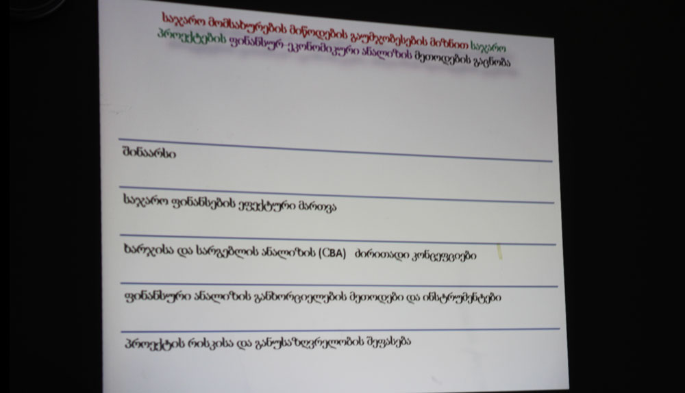 კურსის მიზანი გახლდათ სახელმწიფო ფინანსების ეფექტური მართვის ხელშეწყობა. შეხვედრაზე განიხილეს: სახელმწიფო პროექტების შეფასება, შემოსავლისა და სარგებლის ანალიზის კონცეფცია, ფინანსური ანალიზის განხორციელების მეთოდები და ინსტრუმენტები, პროექტის რისკისა და განუსაზღვრელობის შეფასების კრიტერიუმები და სხვ.