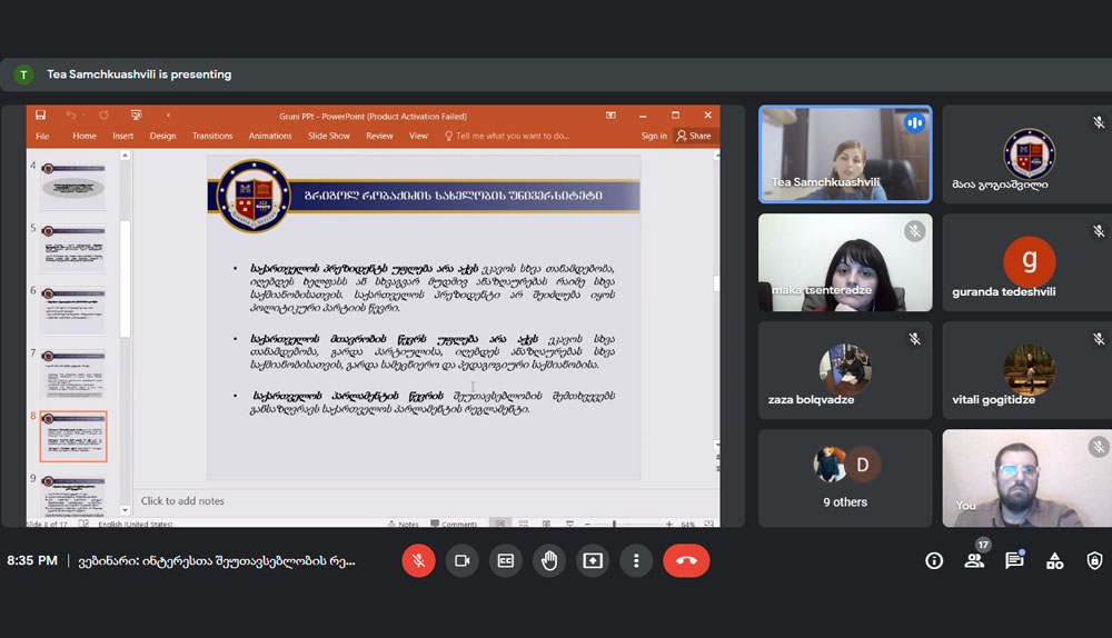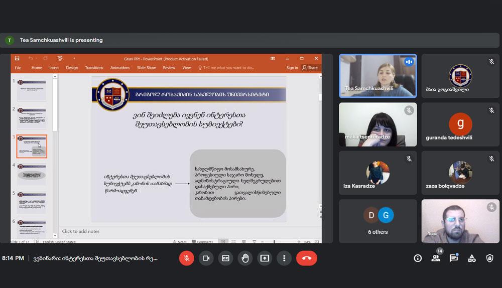 2022 წლის 07 აპრილს გრიგოლ რობაქიძის სახელობის უნივერსიტეტის საჯარო მმართველობის სამეცნიერო-კვლევითი ინსტიტუტისა და საჯარო მმართველობისა და პოლიტიკის სკოლის ორგანიზებით გაიმართა ვებინარი თემაზე: ინტერესთა შეუთავსებლობის რეგულირება საჯარო სამსახურში“.