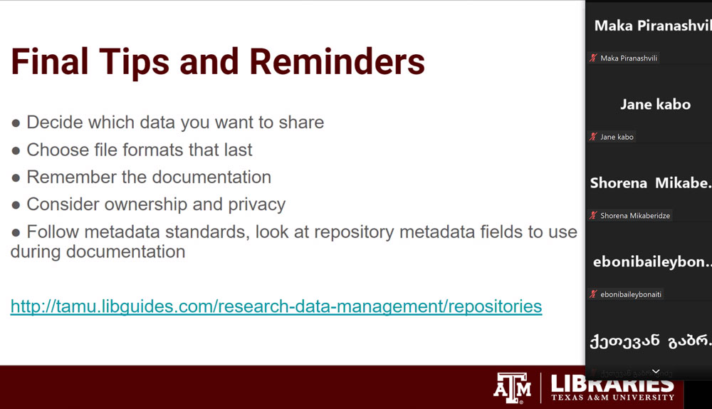 მეორე სემინარს უძღვებოდა ტეხას A&M უნივერსიტეტის პროფესორი, ტეხასის მონაცემთა საცავის წარმომადგენელი, დოქტორი ლაურა სარე, რომელმაც აუდიტორიას გაუზიარა გამოცდილება კვლევის მონაცემთა მენეჯმენტისა და საცავებში მონაცემთა დარეგისტრირებისა და გამოყენების თაობაზე.