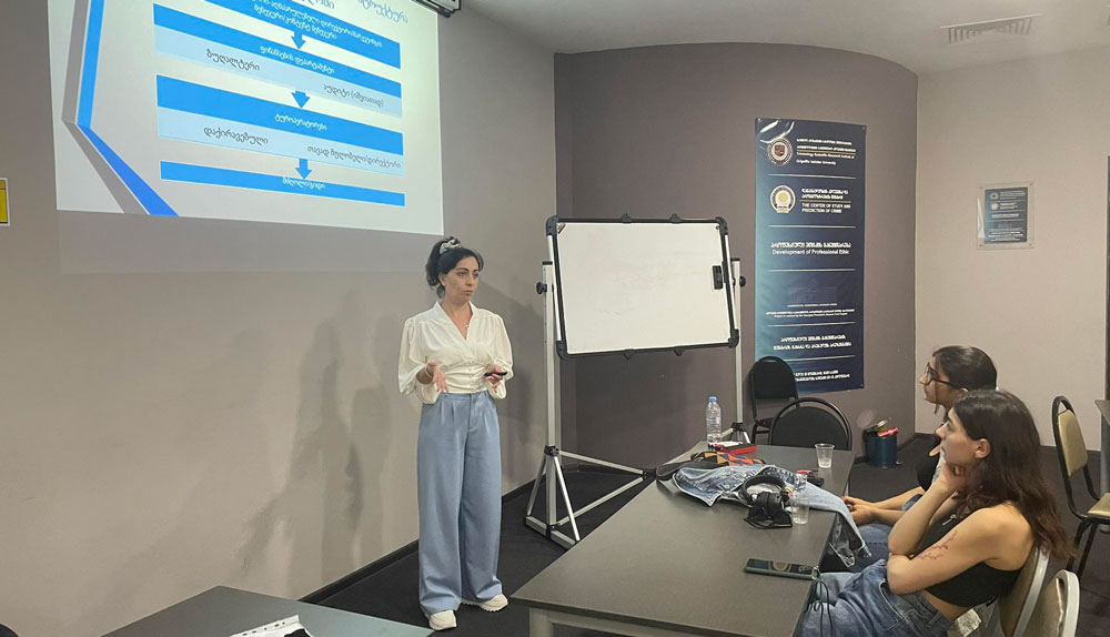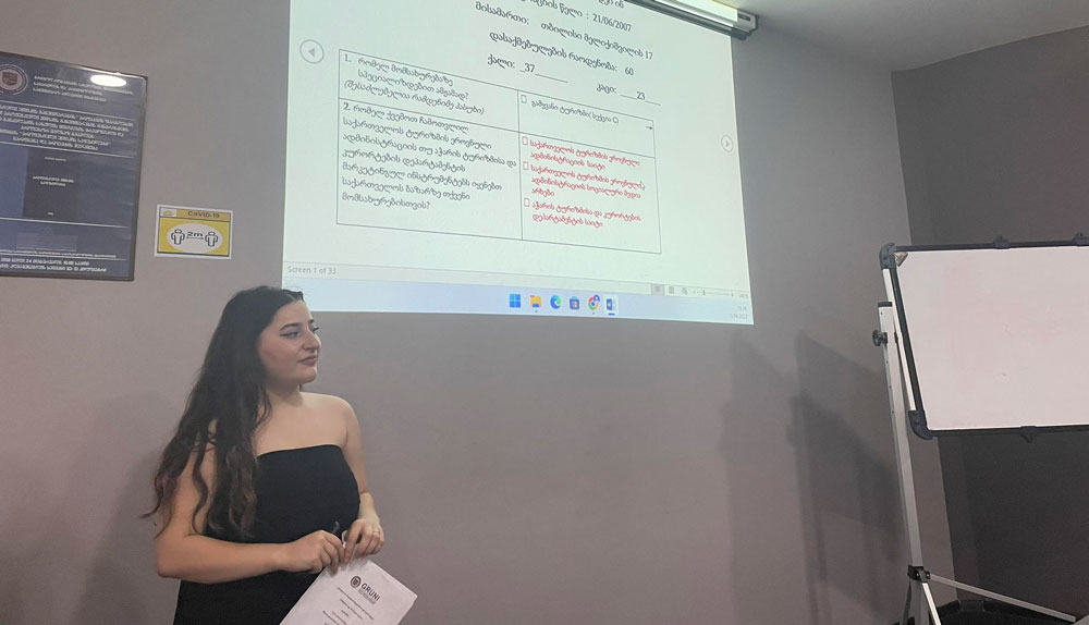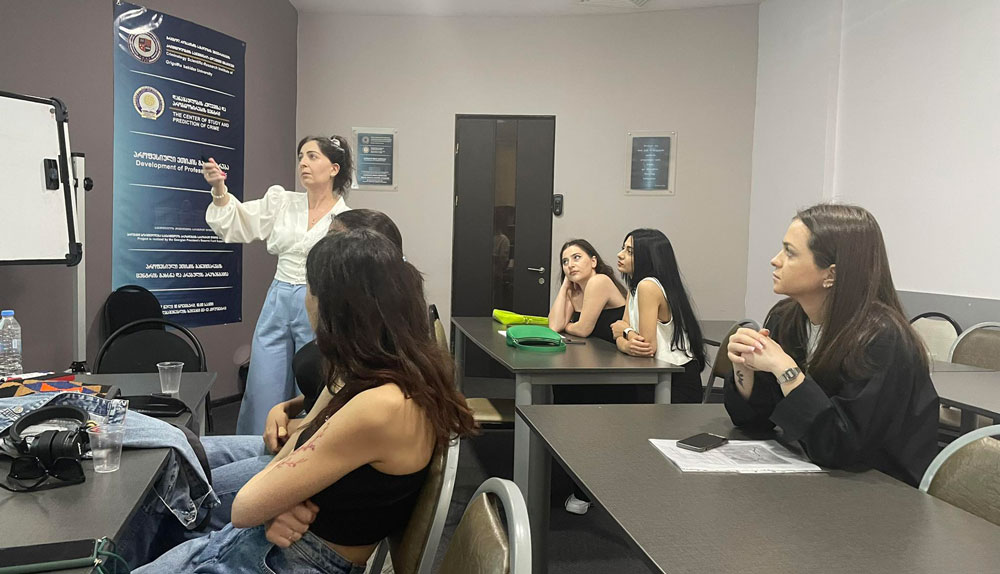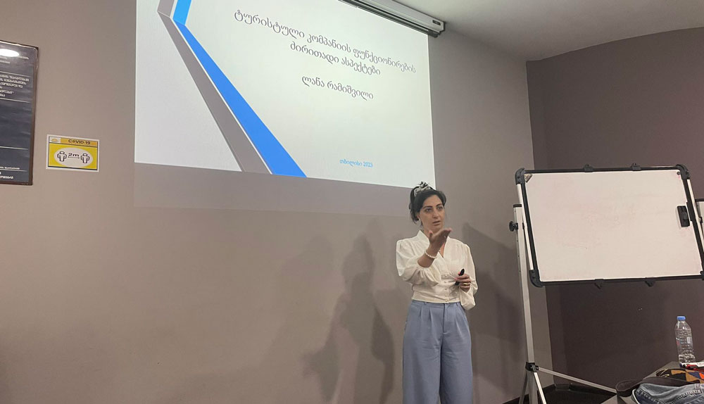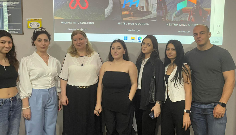 შეხვედრის დასასრულს ტურიზმის პროგრამის სტუდენტებმა დისციპლინის ლექტორს, ასოცირებულ პროფესორ მაკა ფირანაშვილს და მოწვეულ დარგის სპეციალისტს ლანა რამიშვილს წარუდგინეს ინდივიდუალური სასწავლო-კვლევითი პროექტი ტურისტული კომპანიების შესახებ, 7 -დღიანი ტური საქართველოში და საინტერესო პროფესიული რჩევებიც მიიღეს.