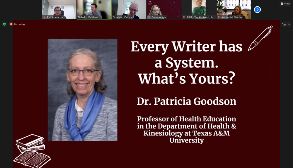 კვლევითი სემინარების ბოლო შეხვედრა 9 ნოემბერს გაიმართა და მას უძღვებოდა დოქტორი პატრიცია გუდსონი, ტეხასის A&M უნივერსიტეტის საპრეზიდენტო პროფესორი ჯანდაცვის სფეროში. ლექციის ფარგლებში, პროფესორმა გუდსონმა აუდიტორიას გაუზიარა აკადემიური წერის ეფექტური სტრატეგია და რესურსი.