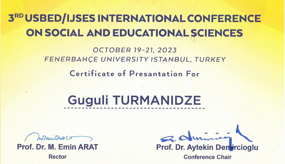 სამეცნიერო ნაშრომები და მასალები დაიბეჭდა და გამოქვეყნდა საერთაშორისო სამეცნიერო ჟურნალში “3rd USBED/IJSES International Conference on Social and Educational Sciences“ (October, 19-21, 2023) ISBN: 978-625-00-8242-3