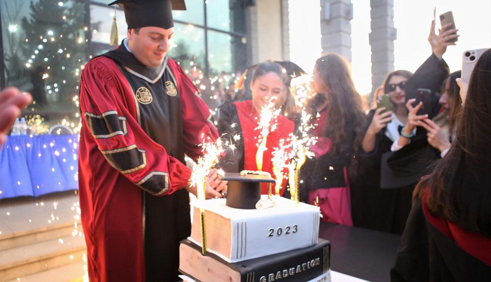 სტუდენტური ჰიმნისა და ფოიერვერკების ფონზე გაიჭრა სადღესასწაულო ტორტი.