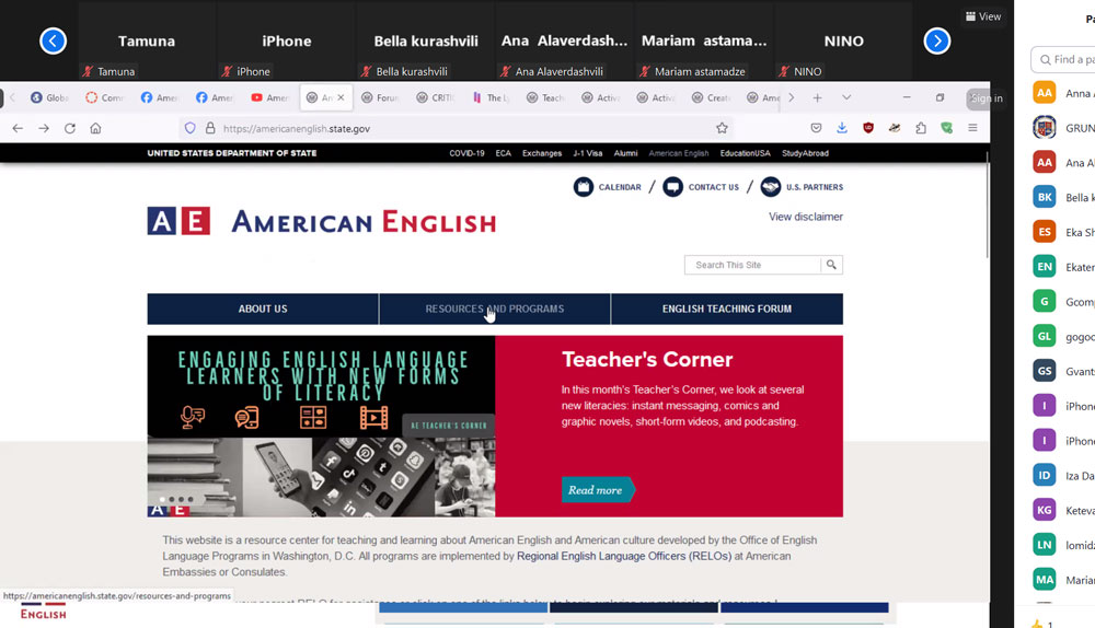 მაიკ მენსფილდმა მონაწილეებს გააცნო აშშ-ის სახელმწიფო დეპარტამენტისა და ამერიკული ინგლისური ენის ორგანიზაციის სხვადასხვა ღირებული რესურსი: წინასწარ შემუშავებულ კურსები საკლასო ოთახში ინტეგრაციისთვის, პროფესიული განვითარების მოდულები, რომლებიც მიზნად ისახავს სწავლების პრაქტიკის ამაღლებას, ასევე, წინასწარ შემუშავებულ გაკვეთილები და აქტივობები დინამიკური და ეფექტური სწავლების სტრატეგიების გასაძლიერებლად. გარდა ამისა, მონაწილეებს ჰქონდათ წვდომა აკადემიურ პუბლიკაციებზე თავიანთი სასწავლო რეპერტუარის გასამდიდრებლად.