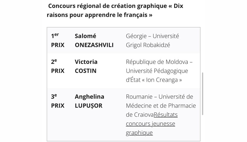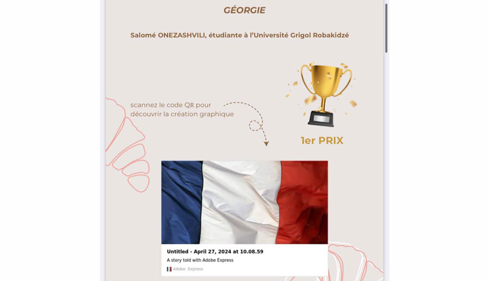 2024 წლის 25 მაისს, ფრანკოფონიების საუნივერსიტეტო სააგენტომ გამოაქვეყნა აღმოსავლეთი და ცენტრალური ევროპის რეგიონში გამოცხადებული გრაფიკული დიზაინის საერთაშორისო კონკურსის “ათი მიზეზი ფრანგული ენის შესასწავლად“ შედეგები, რომლის თანახმად, გრიგოლ რობაქიძის სახელობის უნივერსიტეტის ჰუმანიტარული და სოციალური მეცნიერებების სკოლის სტუდენტმა სალომე ონეზაშვილმა დაიკავა პირველი ადგილი. სალომეს გადაეცემა გამარჯვებულის სიგელი და პირველი ადგილისთვის განკუთვნილი ფულადი ჯილდო.