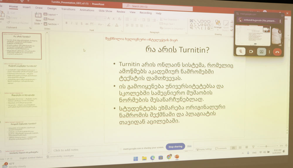 დეტალურად იქნა განხილული პლაგიატის გამოვლენის თანამედროვე მიდგომები და პრევენციის მაგალითები. ყურადღება დაეთმო, ასევე, Turnitin-ის სისტემაში მიღებული შედეგების სწორად ინტერპრეტირებისა და შეფასების ეთიკურ ასპექტებს. მონაწილეებმა მიიღეს პრაქტიკული რეკომენდაციები აკადემიური ტექსტების ავტორობის, ციტირებისა და წყაროების მართვის შესახებ.