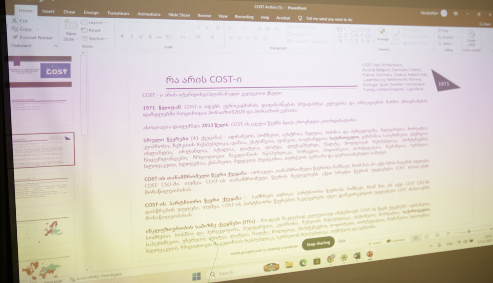 შეხვედრაზე მონაწილეები გაეცნენ ინფორმაციას COST Action-ის პროგრამის არსის, მისი მიზნების, მონაწილეობის შესაძლებლობებისა და საერთაშორისო სამეცნიერო თანამშრომლობის შესახებ. განხილულ იქნა COST Action-ის კვლევით ქსელებში ჩართვის პირობები, განაცხადის მომზადების ძირითადი ეტაპები, დაფინანსების შესაძლებლობები და პროგრამის მნიშვნელობა ახალგაზრდა მკვლევრებისა და აკადემიური პერსონალის პროფესიული განვითარებისათვის.