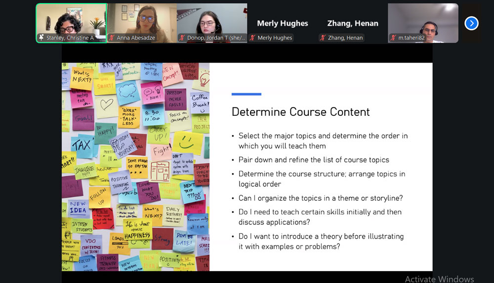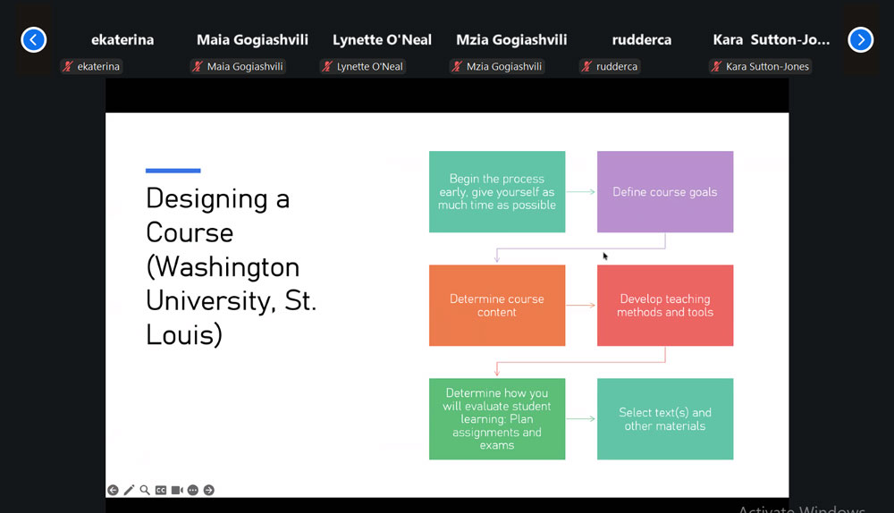 სესია მოიცავდა კურსის სტრუქტურისა და მიზნების დაგეგმვას, სხვადასხვა ტიპის სტუდენტისათვის სწავლების სტრატეგიის შერჩევას, აქტიური და ინტერაქტიული ლექციების მომზადებას, ასევე, შეფასებისა და უკუკავშირის მართვას.